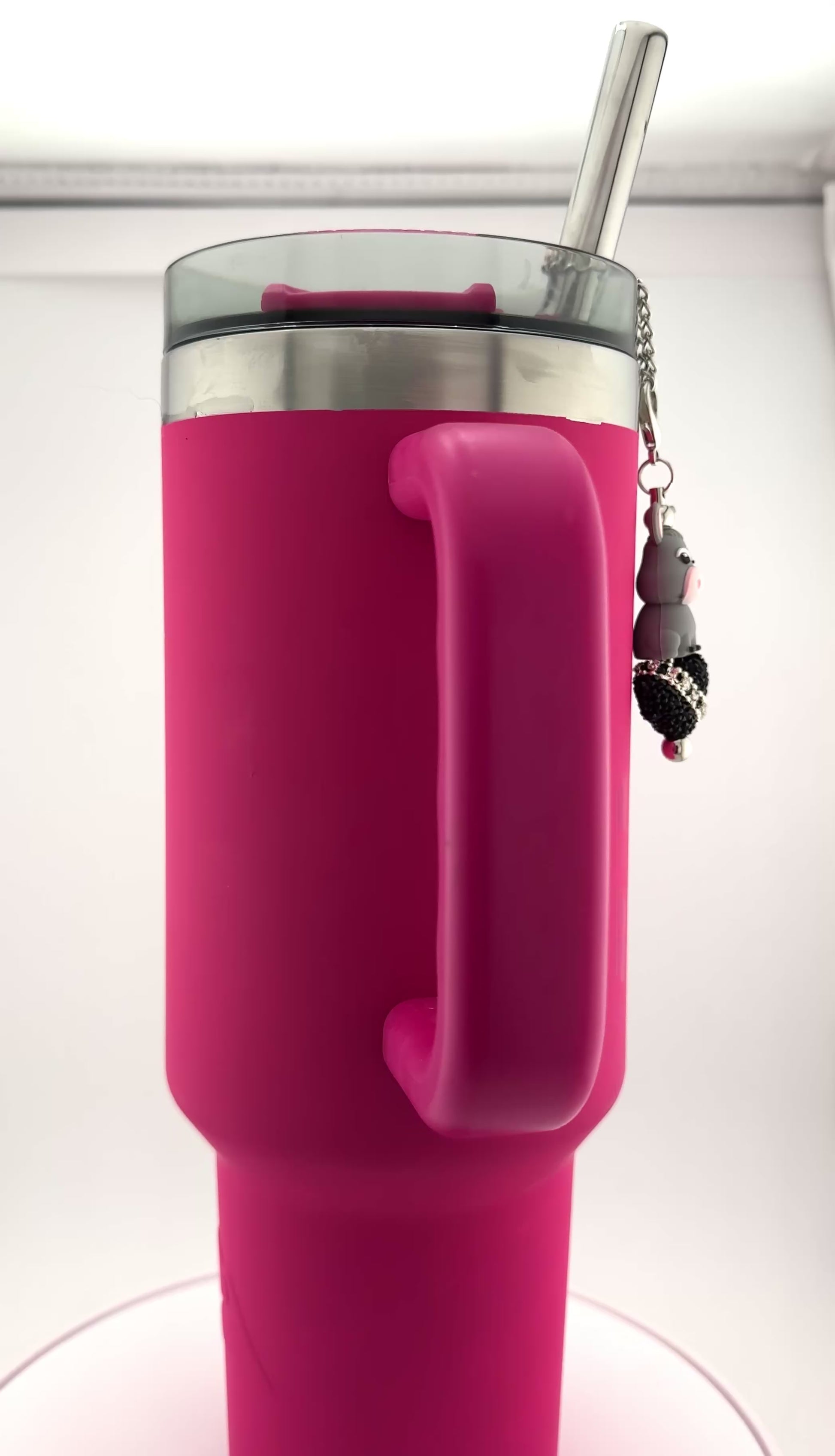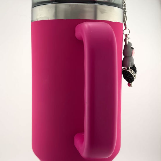 This Black Sparkle Donkey Cup or Straw Charm features a bold heart encrusted with glittering black rhinestones, creating a eye-catching shine. Perched confidently on this radiant heart, an adorable donkey adds a touch of whimsy, while a silver sash studded with sparkling stars wraps around to complete the statement. Perfect for those who want to stand out with unique, shimmering style.