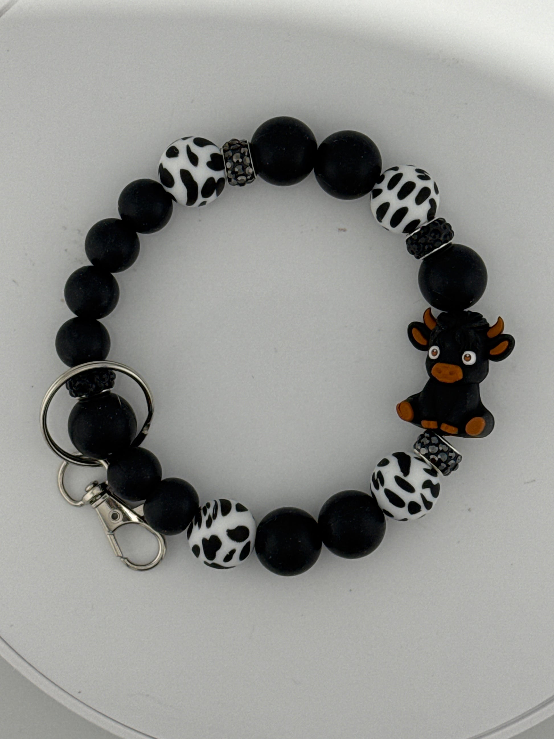 The Classic Black and White Cow wristlet is the perfect accessory for those seeking a clean and timeless look. The adorable black wide-eyed 3d Highland Cow focal bead adds a touch of charm to this functional piece, perfect for carrying your wallet or purse. Upgrade your style with this versatile wristlet that will also keep your keys safe!