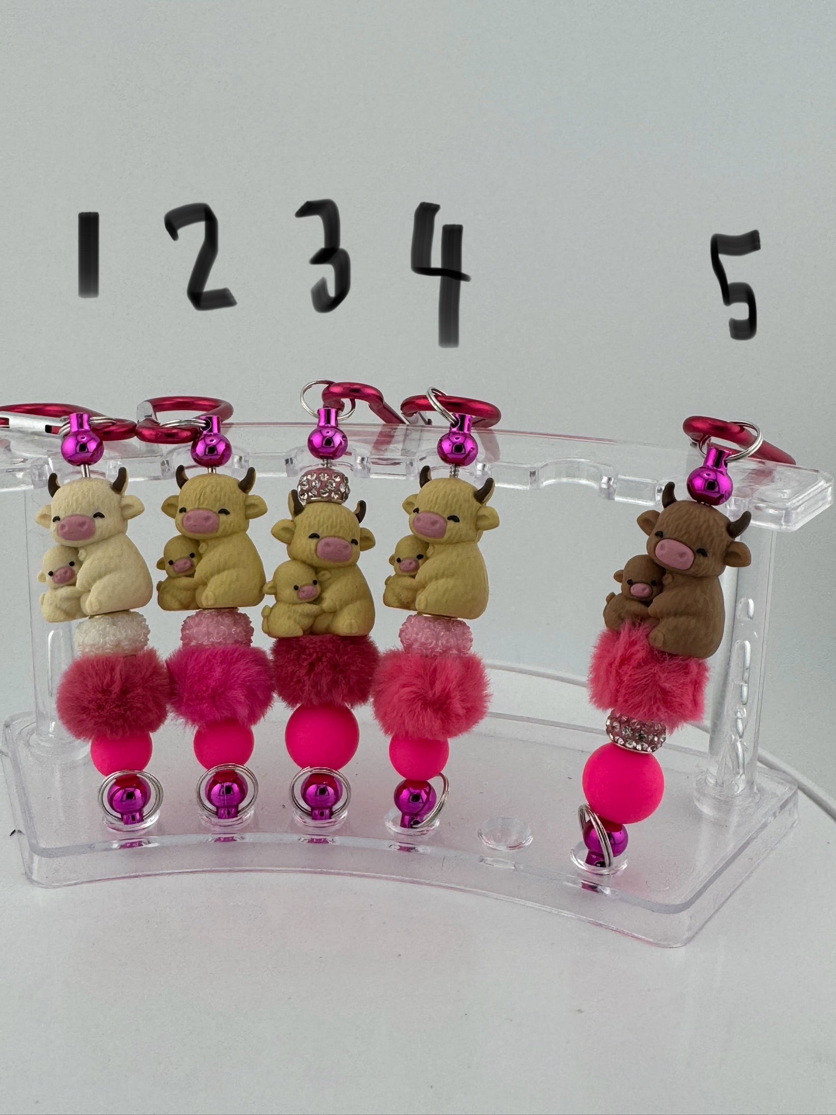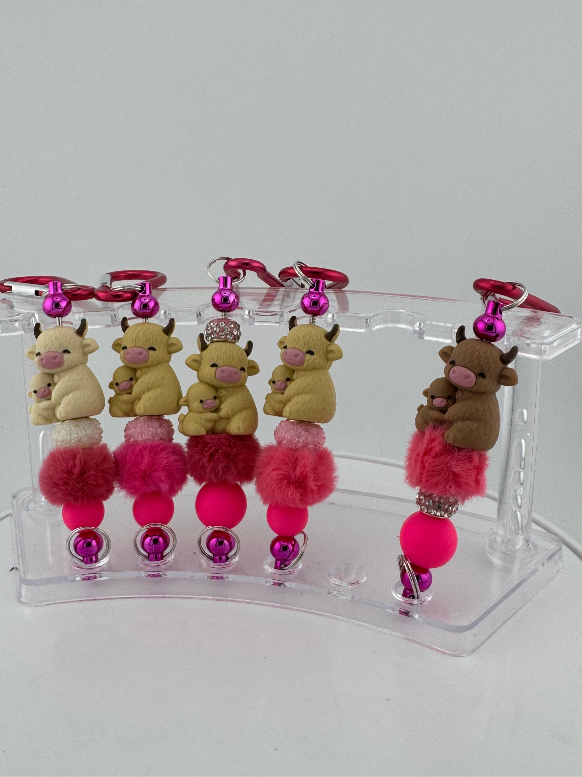 Momma cows love their babies and form strong maternal bonds. Moms in a herd even watch over each others calves! You won’t find a cuter focal bead that this loving pair! Add to it the soft fluffy pink bead that is as fluffy as our hairy coo's fur and you've got the best decoration for your personal items, whether it’s a backpack or a diaper bag or your favorite purse.