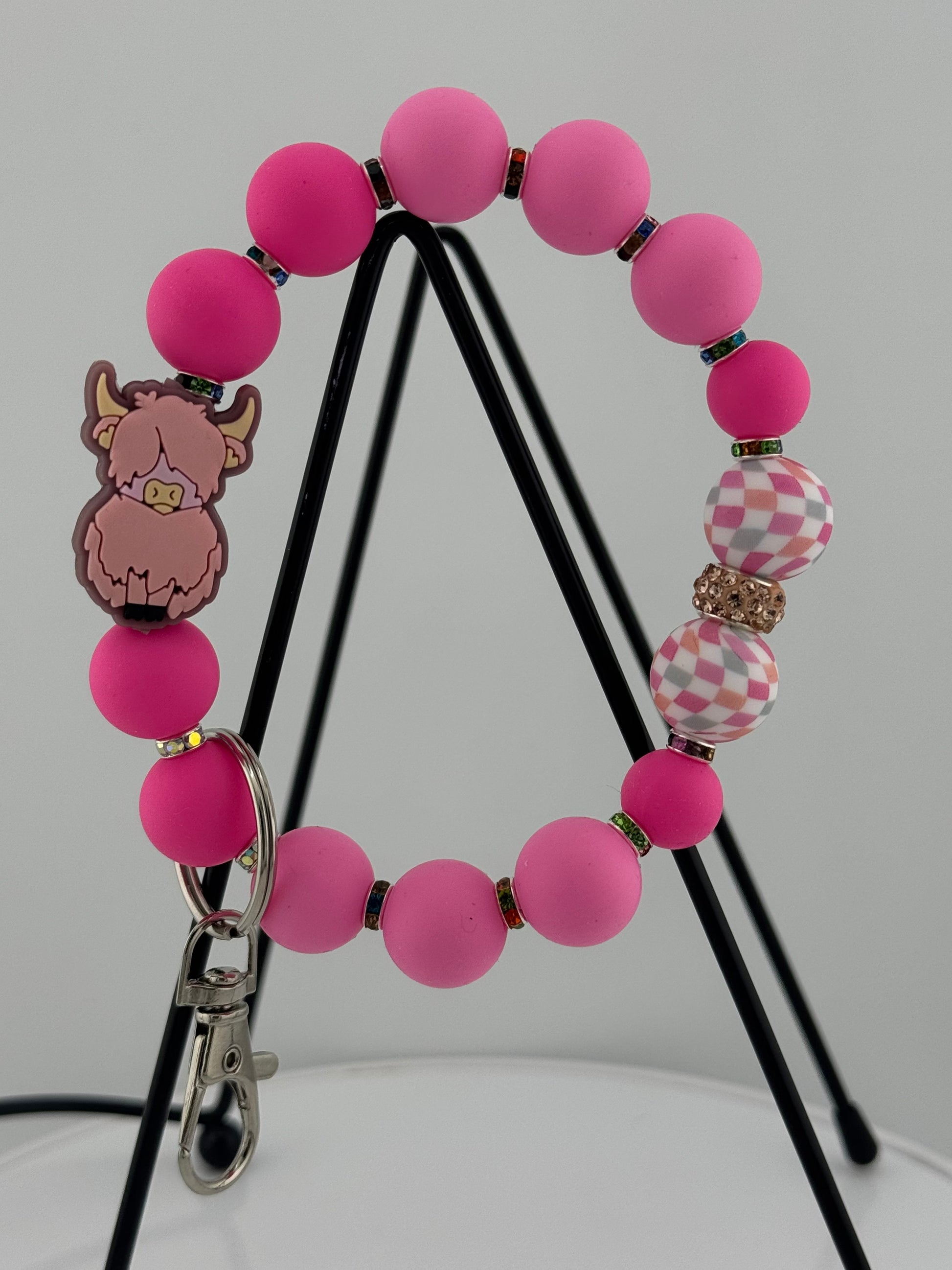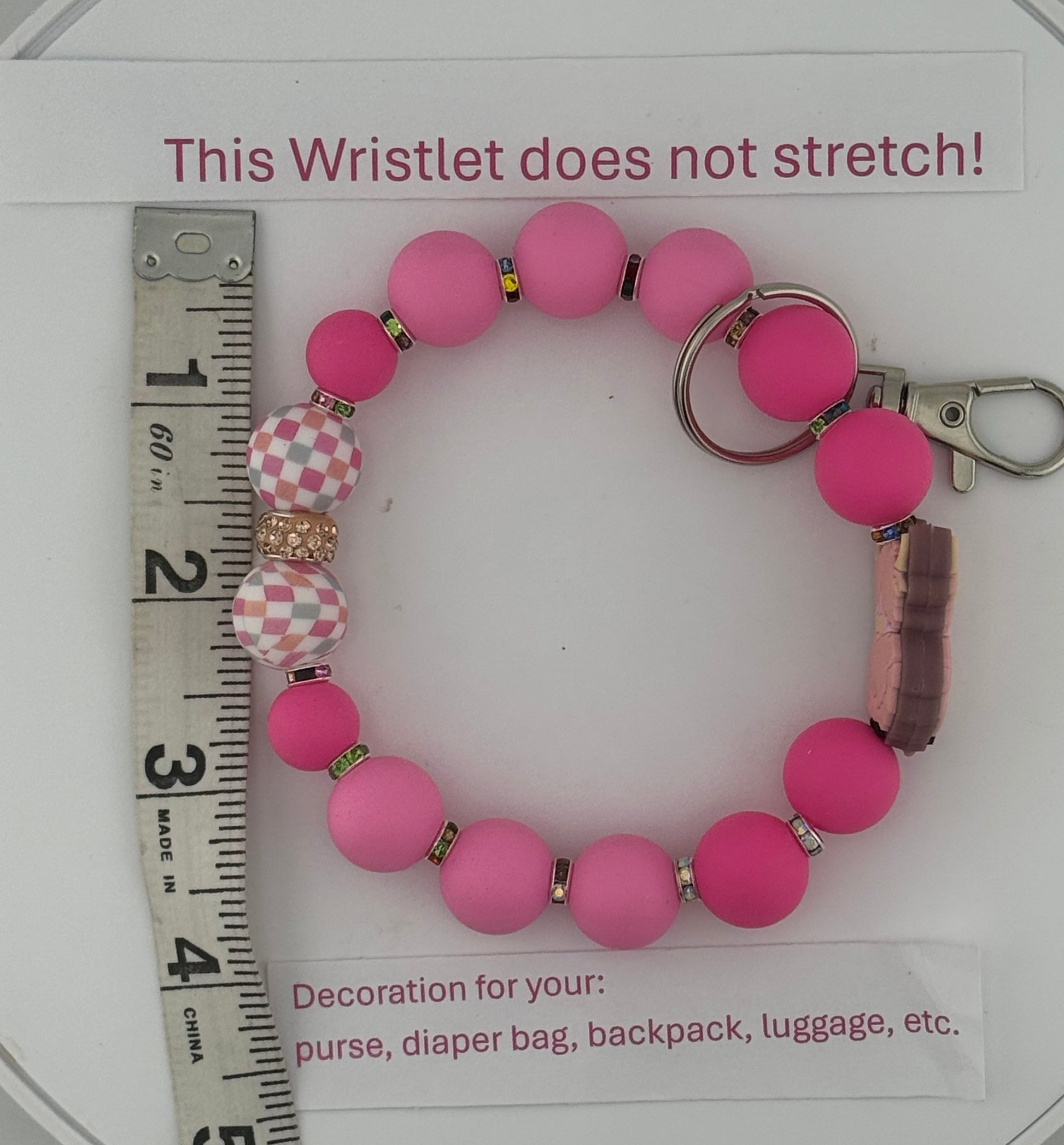 This gorgeous wristlet in beautiful shades of pink, sparkly rhinestones and the gingham-checkered pink & bright-white beads make a stunning wristlet to decorate your favorite personal items!