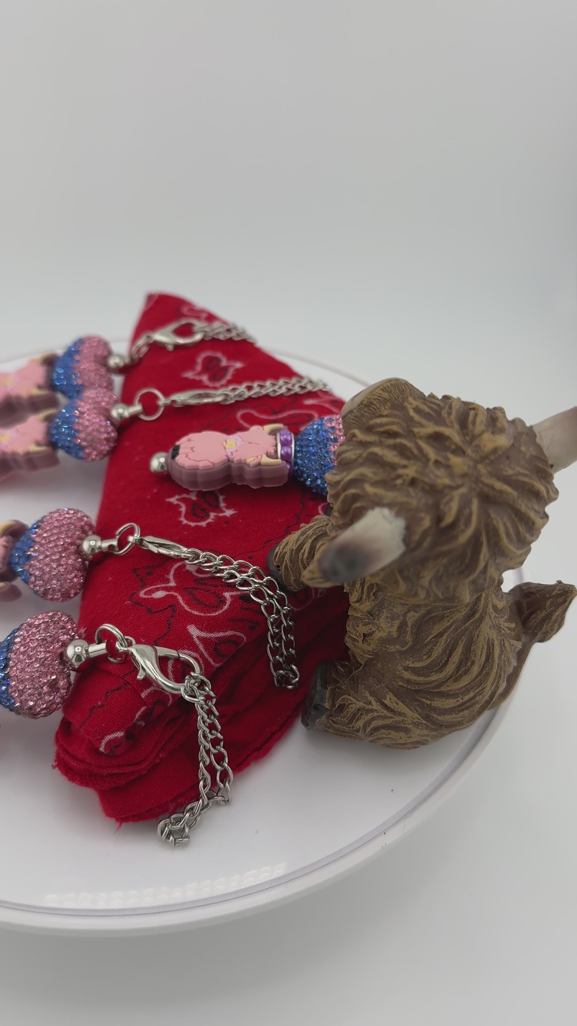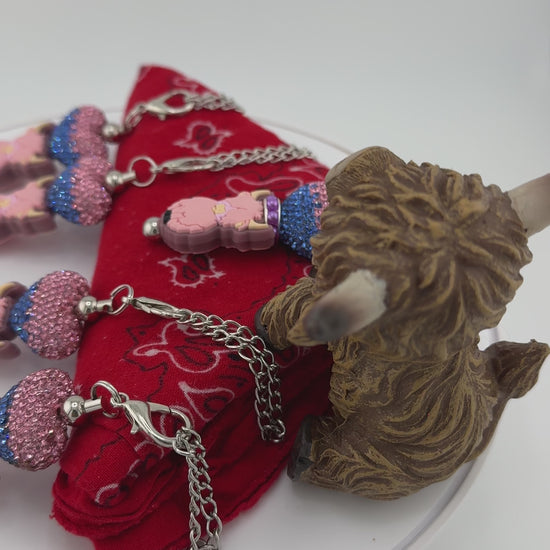 Straw Charm! This adorable pink highland cow decorates your favorite drink with a super sparkly pink and blue heart charm. The large heart and fluffy cow on a silver chain will make your straw SPARKLE!