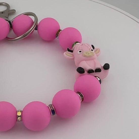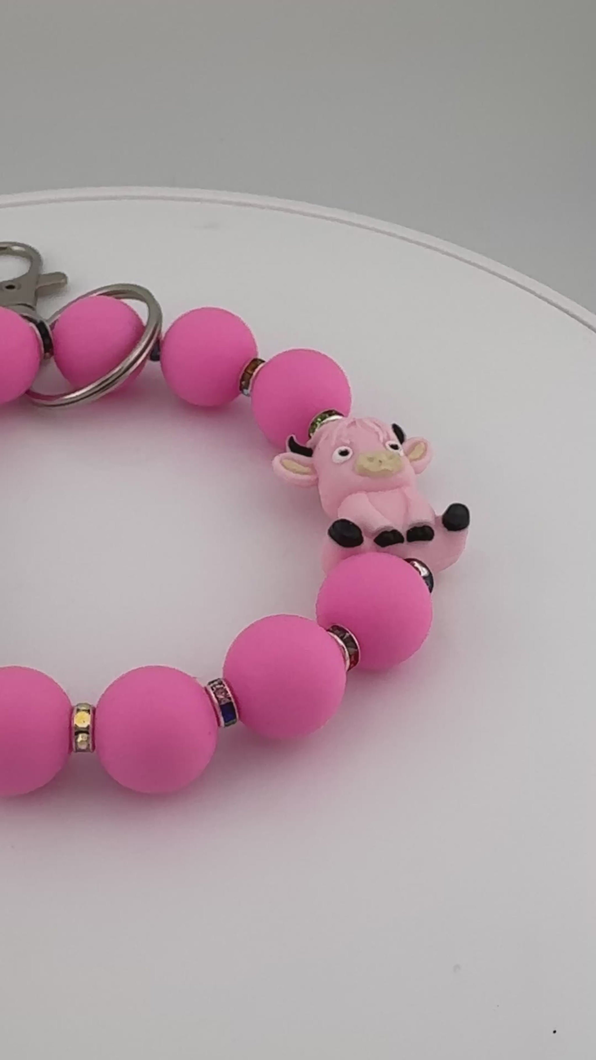 This So Pretty In Pink Wristlet sparkles with fun, featuring a precious pink 3D highland cow bead as its standout star. Galaxy-inspired balls add a whimsical touch, making it a playful and charming accessory perfect for adding a pop of delight to any outfit. See Ruler picture for size. Medium.