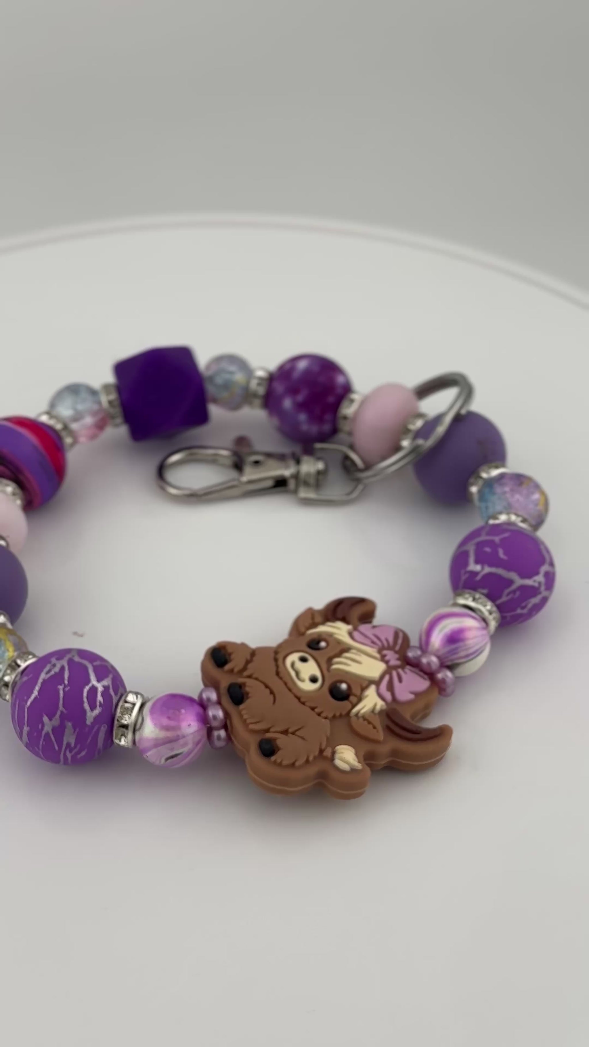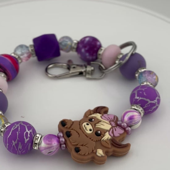 Featuring dazzling lavender beads, one dark purple hexagonal multi-faceted bead and a playful highland cow bead adorned with a cute bow, this wristlet is the perfect accessory to express your unique style and personality. Lightweight and eye-catching, it's ideal for carrying essentials while making a fun, fashionable statement wherever you go.
